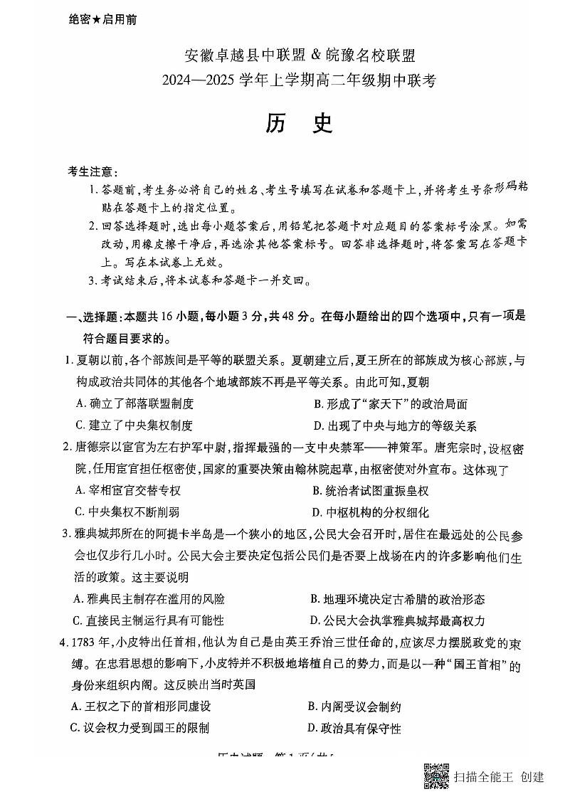 安徽省卓越县中联盟皖豫名校联盟2024-2025学年上学期高二期中联考历史