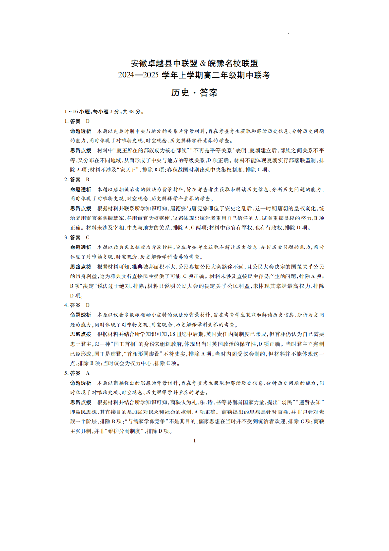 安徽省卓越县中联盟皖豫名校联盟2024-2025学年上学期高二期中联考历史答案