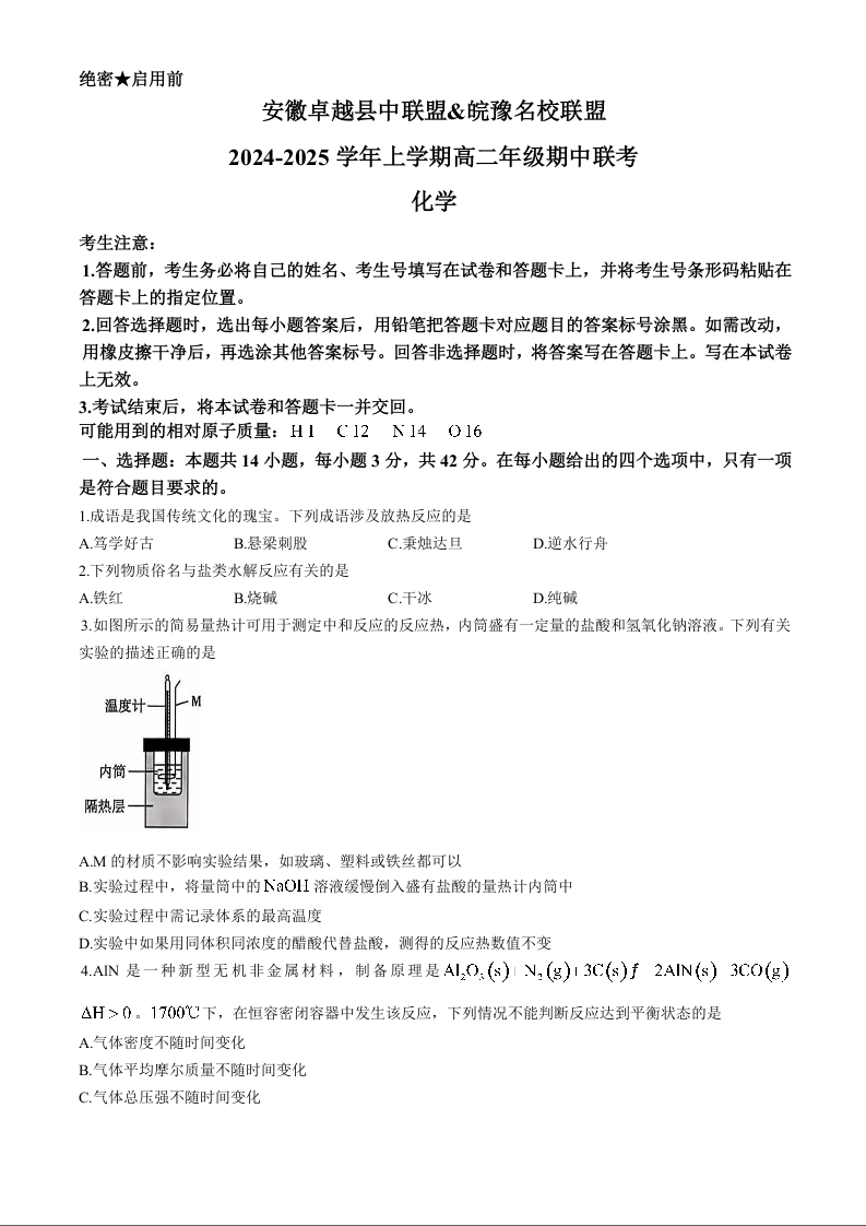 安徽省卓越县中联盟皖豫名校联盟2024-2025学年上学期高二期中联考化学