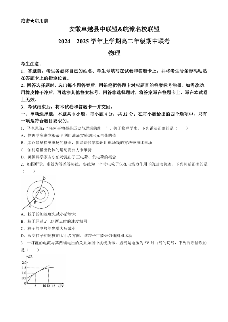 安徽省卓越县中联盟皖豫名校联盟2024-2025学年上学期高二期中联考物理
