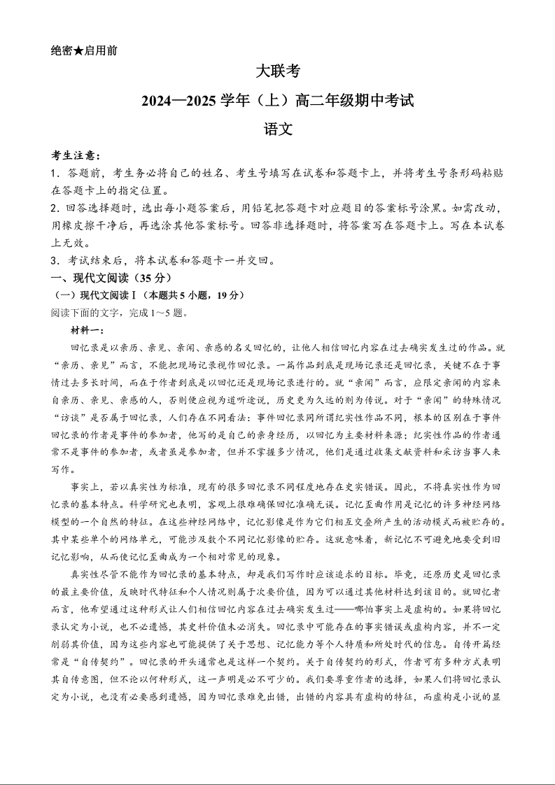 河南省区域高中大联考2024-2025学年高二上学期11月期中考试语文+答案