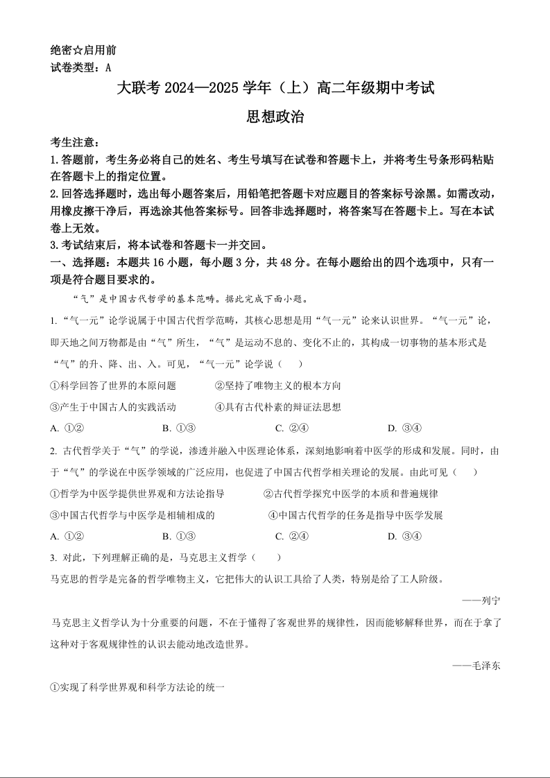 河南省区域高中大联考2024-2025学年高二上学期11月期中考试政治(原卷版)