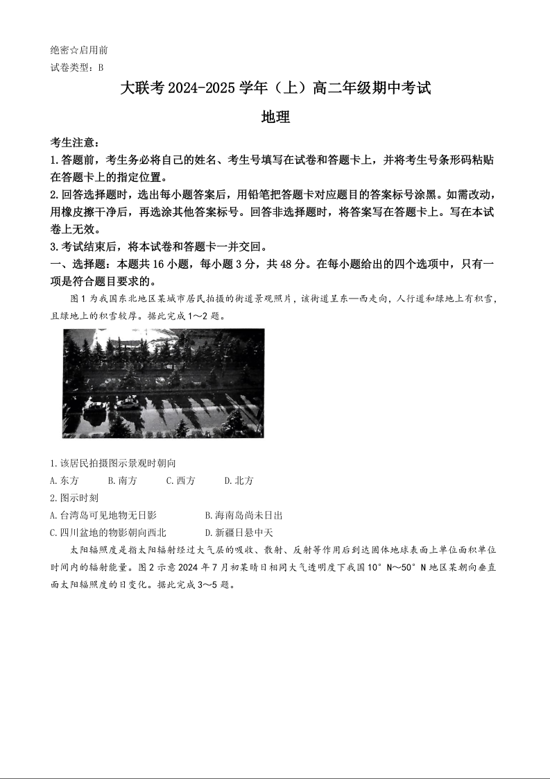 河南省区域高中大联考2024-2025学年高二上学期11月期中考试地理+答案