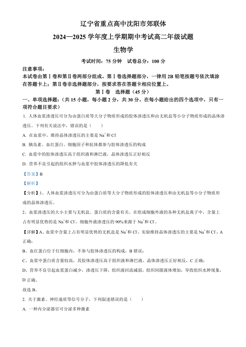 辽宁省沈阳市沈阳市郊联体2024-2025学年高二上学期11月期中生物试题 Word版含解析