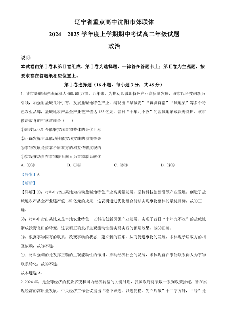 辽宁省沈阳市郊联体2024-2025学年高二上学期期中考试政治试题 Word版含解析