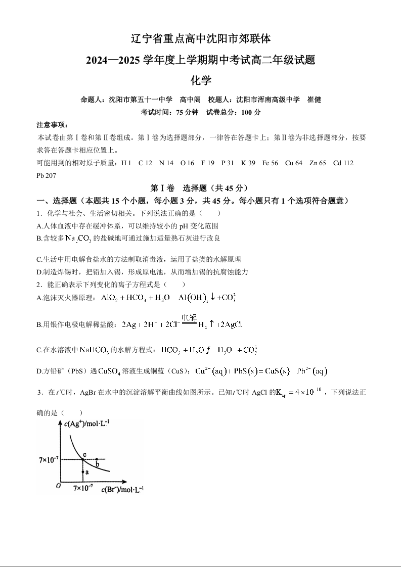 辽宁省重点高中沈阳市郊联体2024-2025学年高二上学期11月期中考试化学 Word版含答案