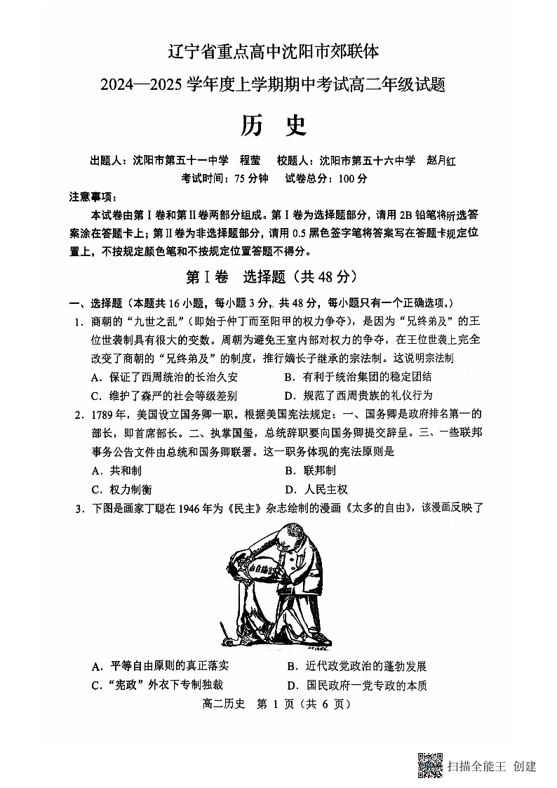 辽宁省重点高中沈阳市郊联体2024-2025学年高二上学期11月期中考试 历史 PDF版含答案