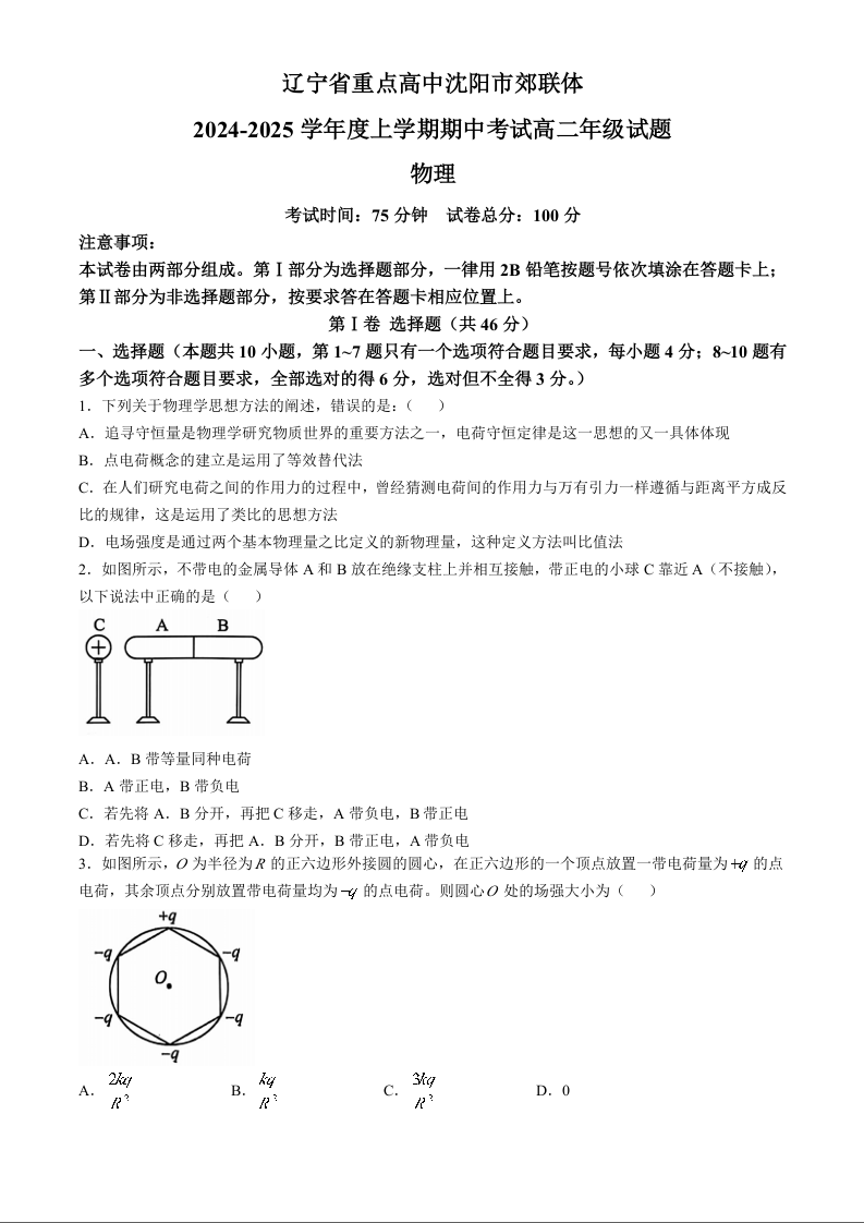 辽宁省重点高中沈阳市郊联体2024-2025学年高二上学期11月期中考试 物理 Word版含解析