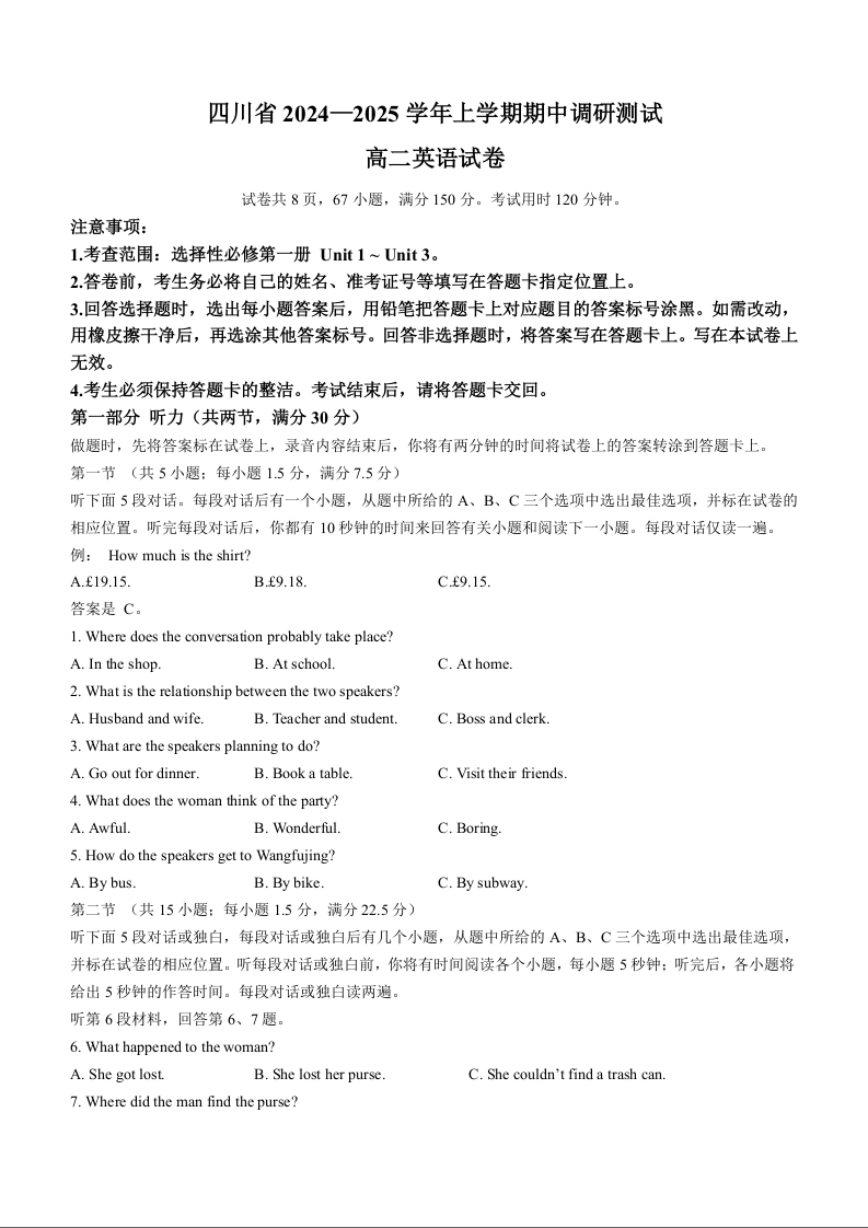 四川省2024-2025学年高二上学期期中调研测试英语+答案