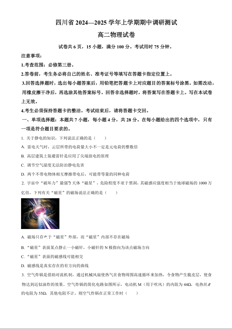 四川省2024-2025学年高二上学期期中调研测试物理(原卷版)