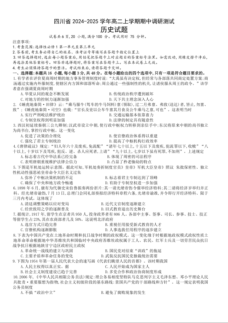 四川省2024-2025学年高二上学期期中调研测试历史+答案