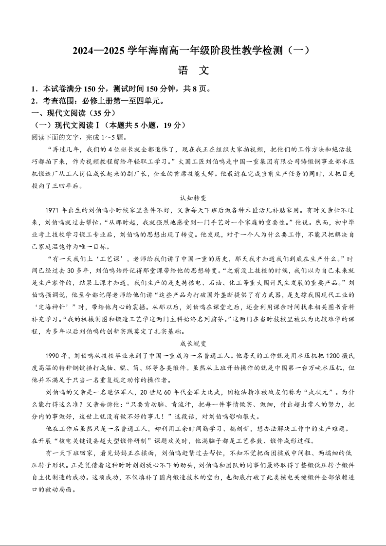 海南省部分高中2024-2025学年高一上学期阶段性教学检测(一)语文+答案