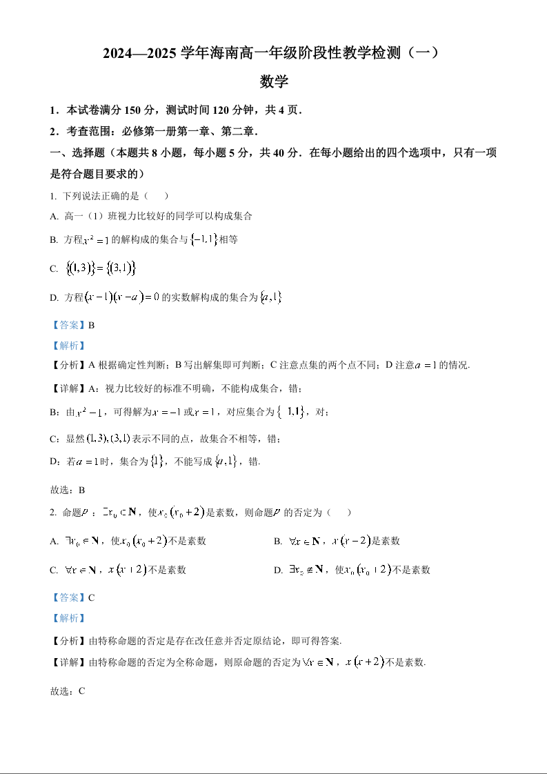 海南省部分高中2024-2025学年高一上学期阶段性教学检测(一)数学(精品解析版)