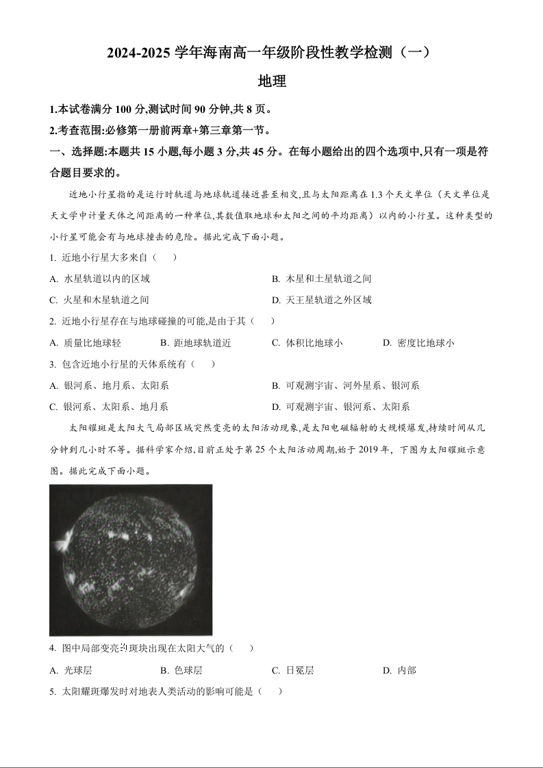 海南省部分高中2024-2025学年高一上学期阶段性教学检测(一)地理(原卷版)