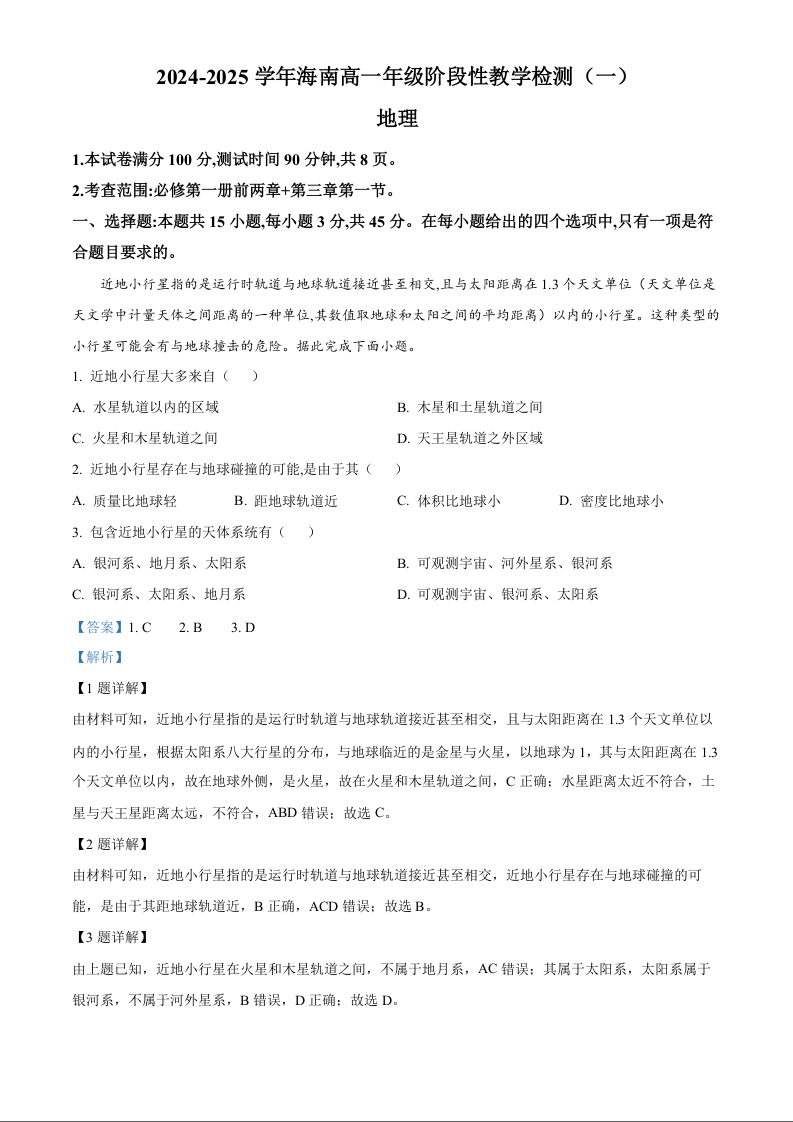 海南省部分高中2024-2025学年高一上学期阶段性教学检测(一)地理(精品解析版)