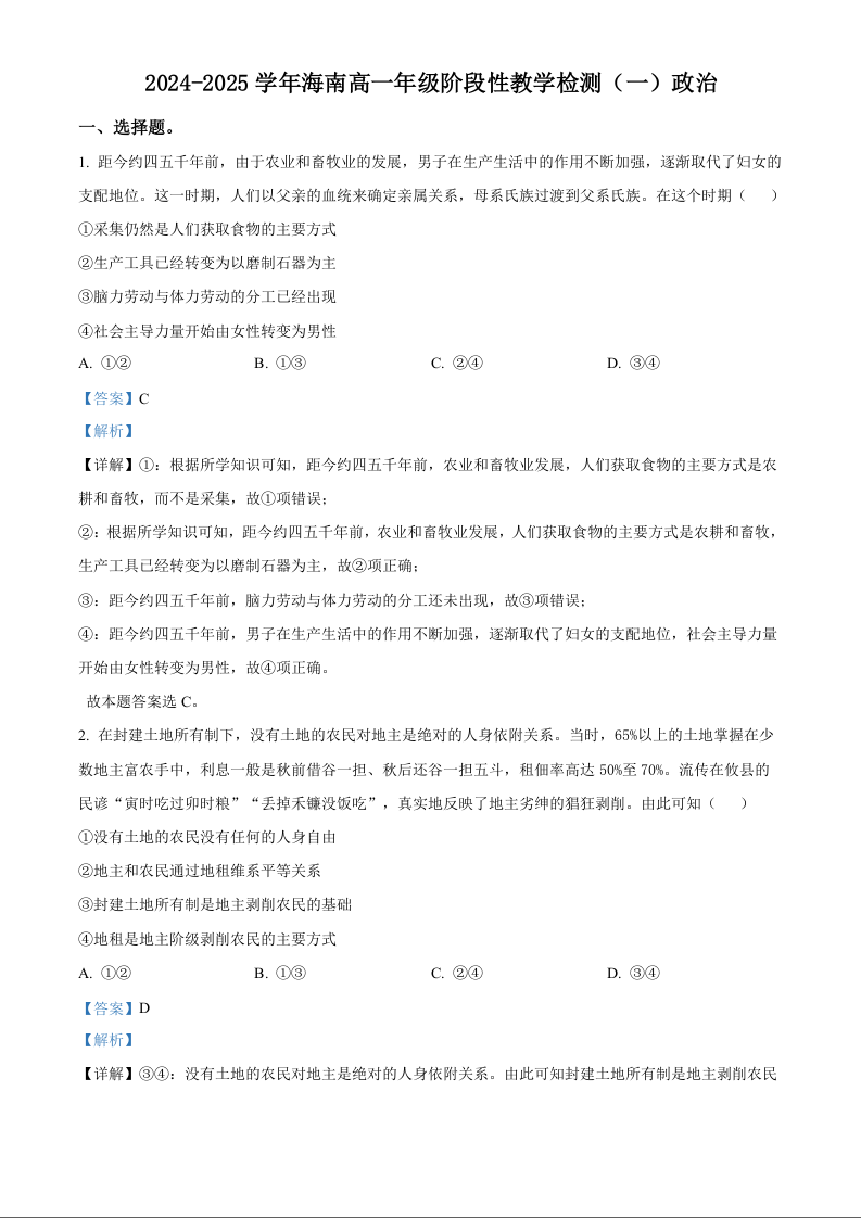 海南省部分高中2024-2025学年高一上学期阶段性教学检测(一)政治(精品解析版)