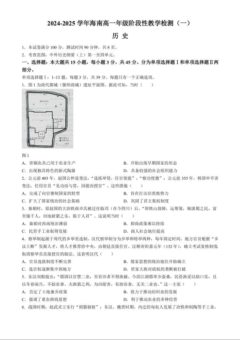 海南省部分高中2024-2025学年高一上学期阶段性教学检测(一)历史