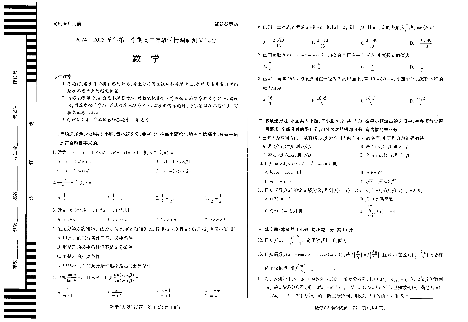 山西省2024-2025学年第一学期高三年级学情调研测试11月期中考试数学(A卷)