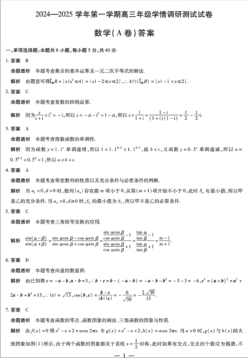 山西省2024-2025学年第一学期高三年级学情调研测试11月期中考试数学(A卷)答案
