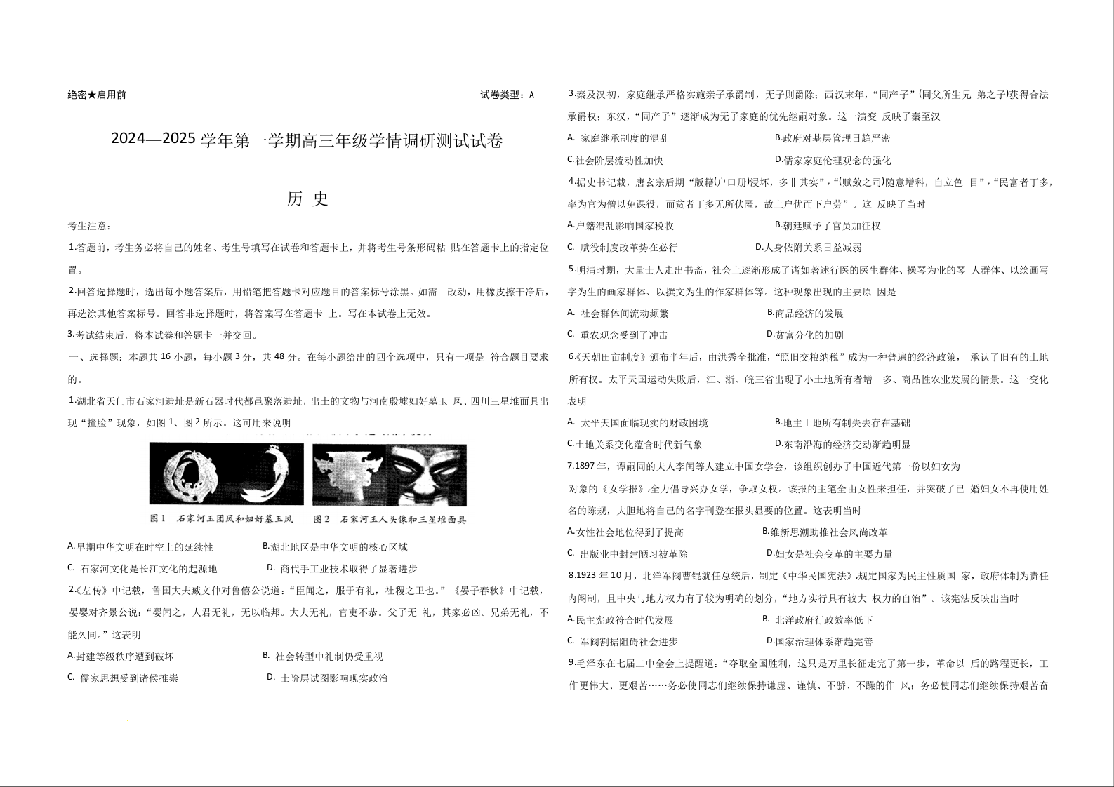 山西省2024-2025学年第一学期高三年级学情调研测试11月期中考试历史(A卷)