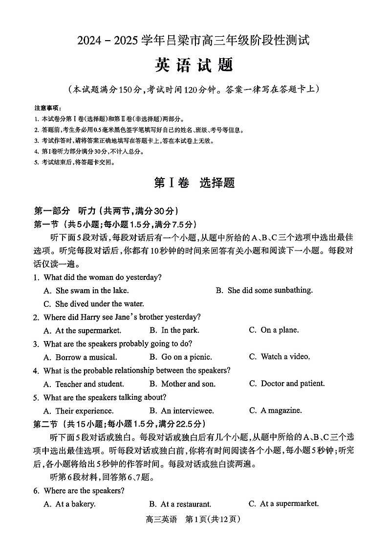 山西省吕梁市2025届高三上学期11月期中考试英语