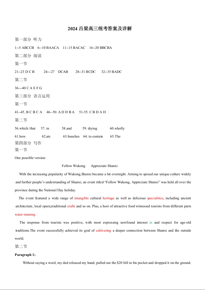山西省吕梁市2025届高三上学期11月期中考试英语答案