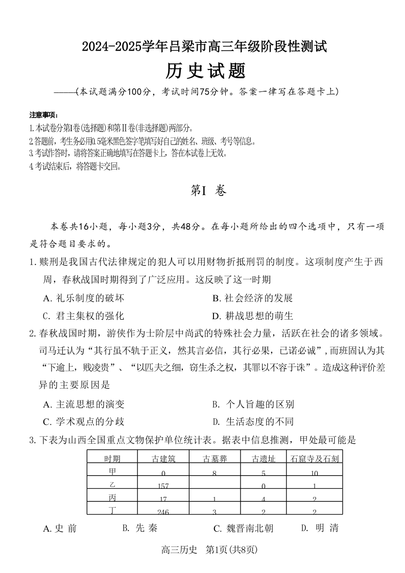 山西省吕梁市2025届高三上学期11月期中考试历史
