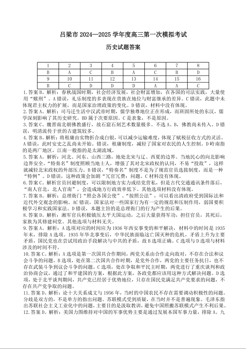 山西省吕梁市2025届高三上学期11月期中考试历史答案