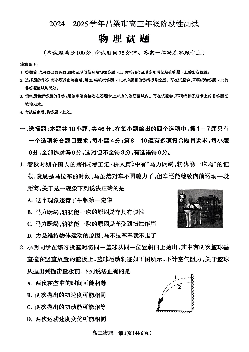 山西省吕梁市2025届高三上学期11月期中考试物理