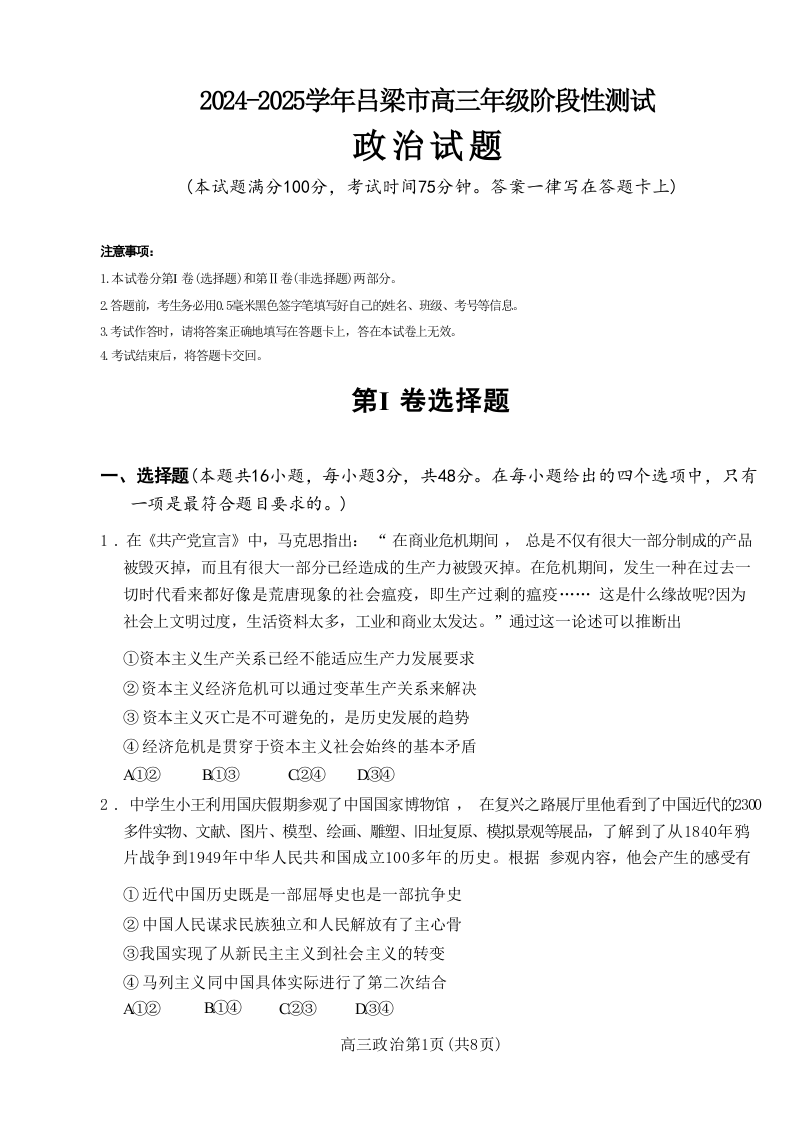 山西省吕梁市2025届高三上学期11月期中考试政治