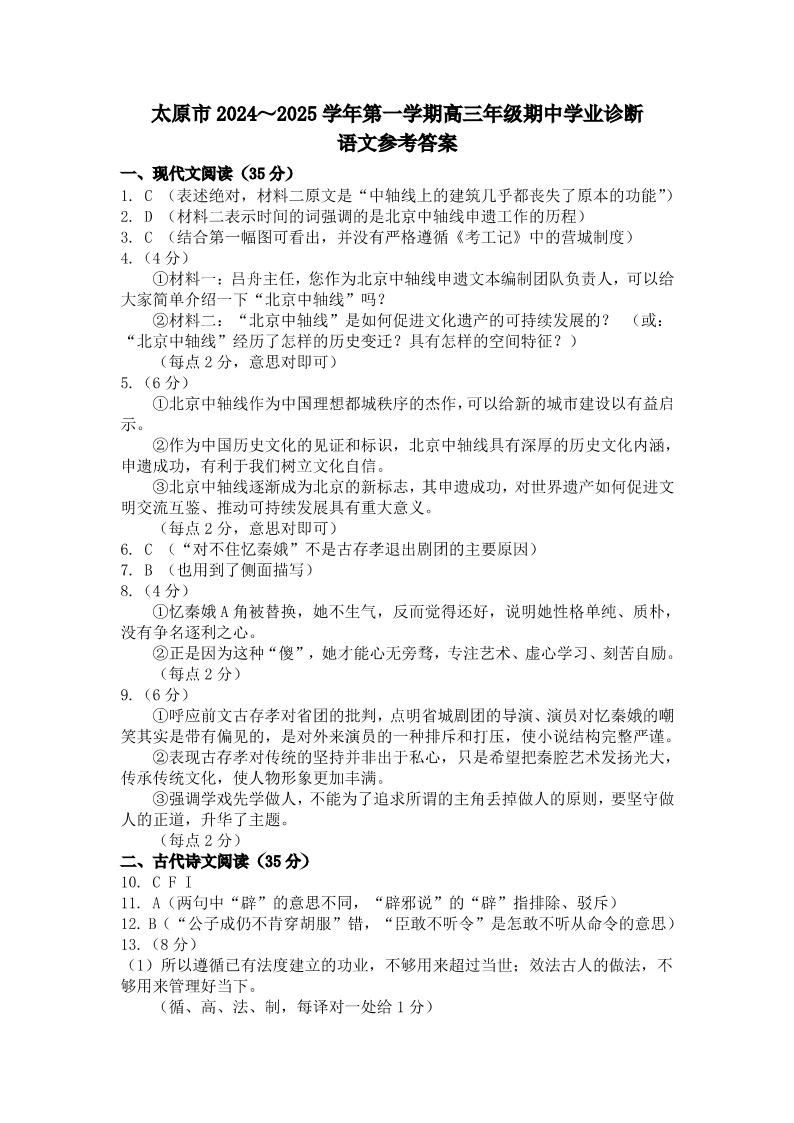 山西省太原市2025届高三第一学期期中测评语文答案