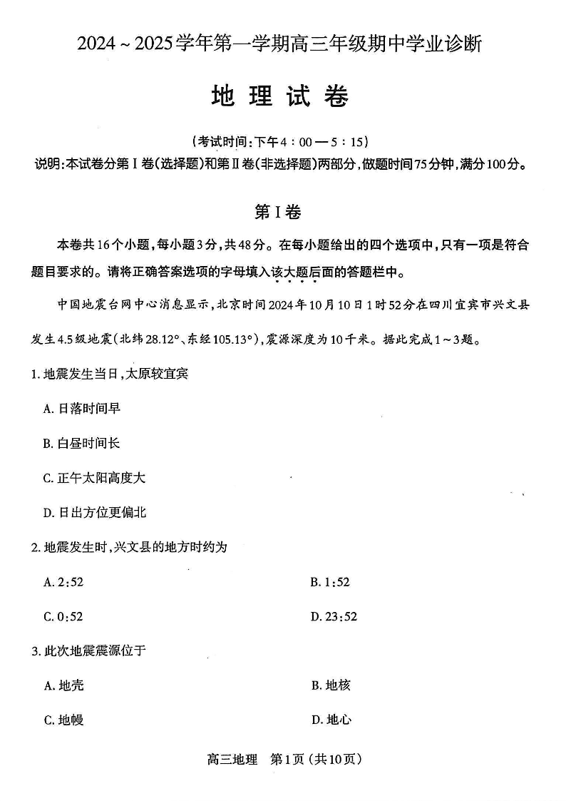 山西省太原市2025届高三第一学期期中测评地理
