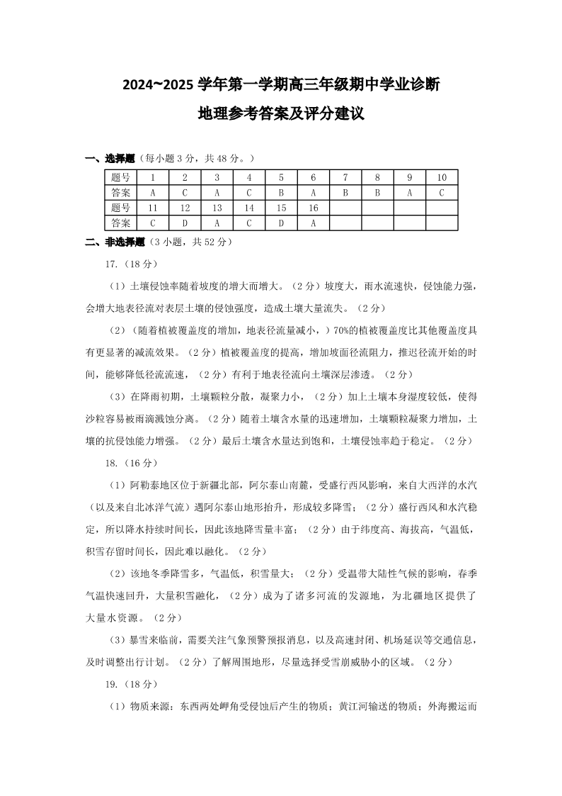 山西省太原市2025届高三第一学期期中测评地理答案