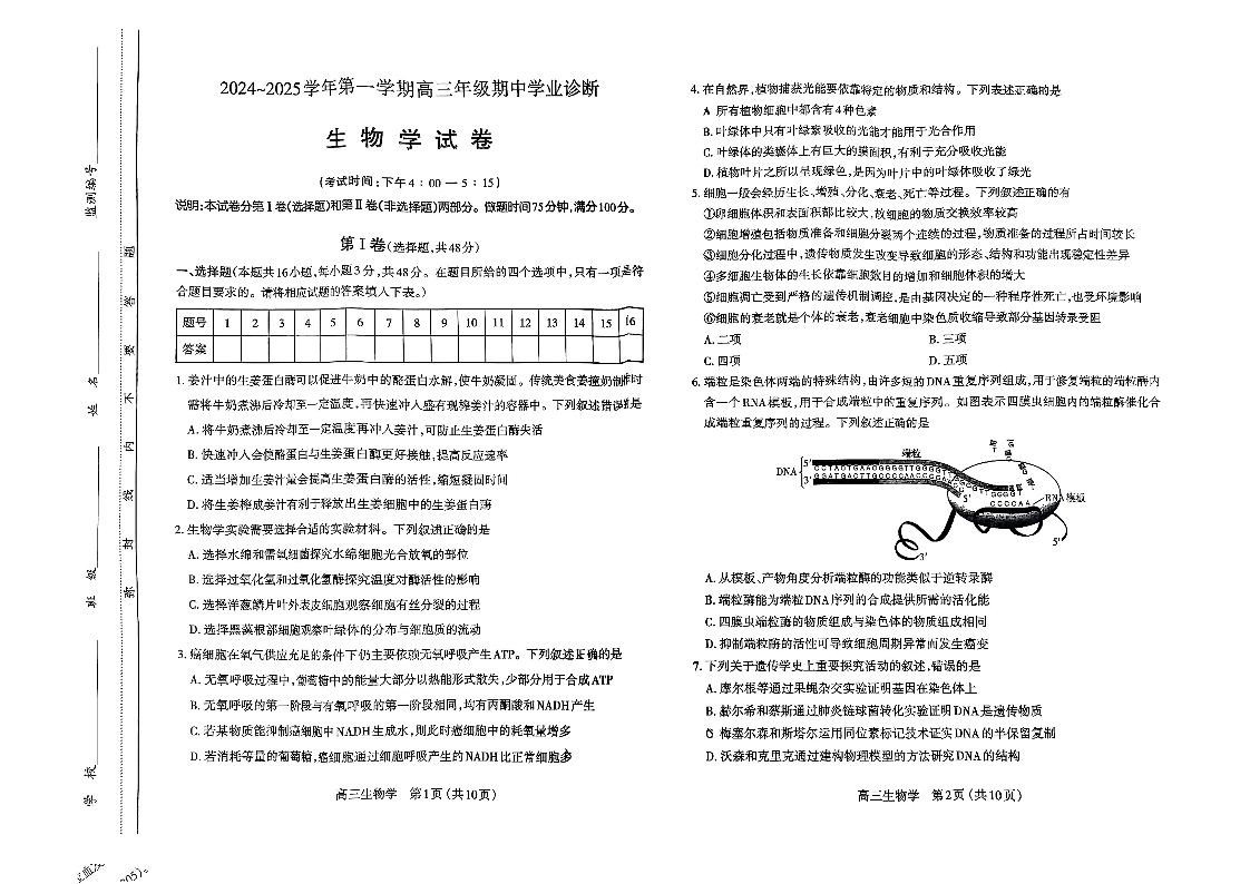 山西省太原市2025届高三第一学期期中测评生物