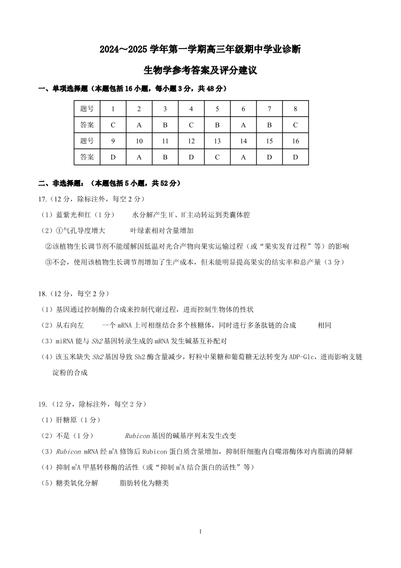 山西省太原市2025届高三第一学期期中测评生物答案