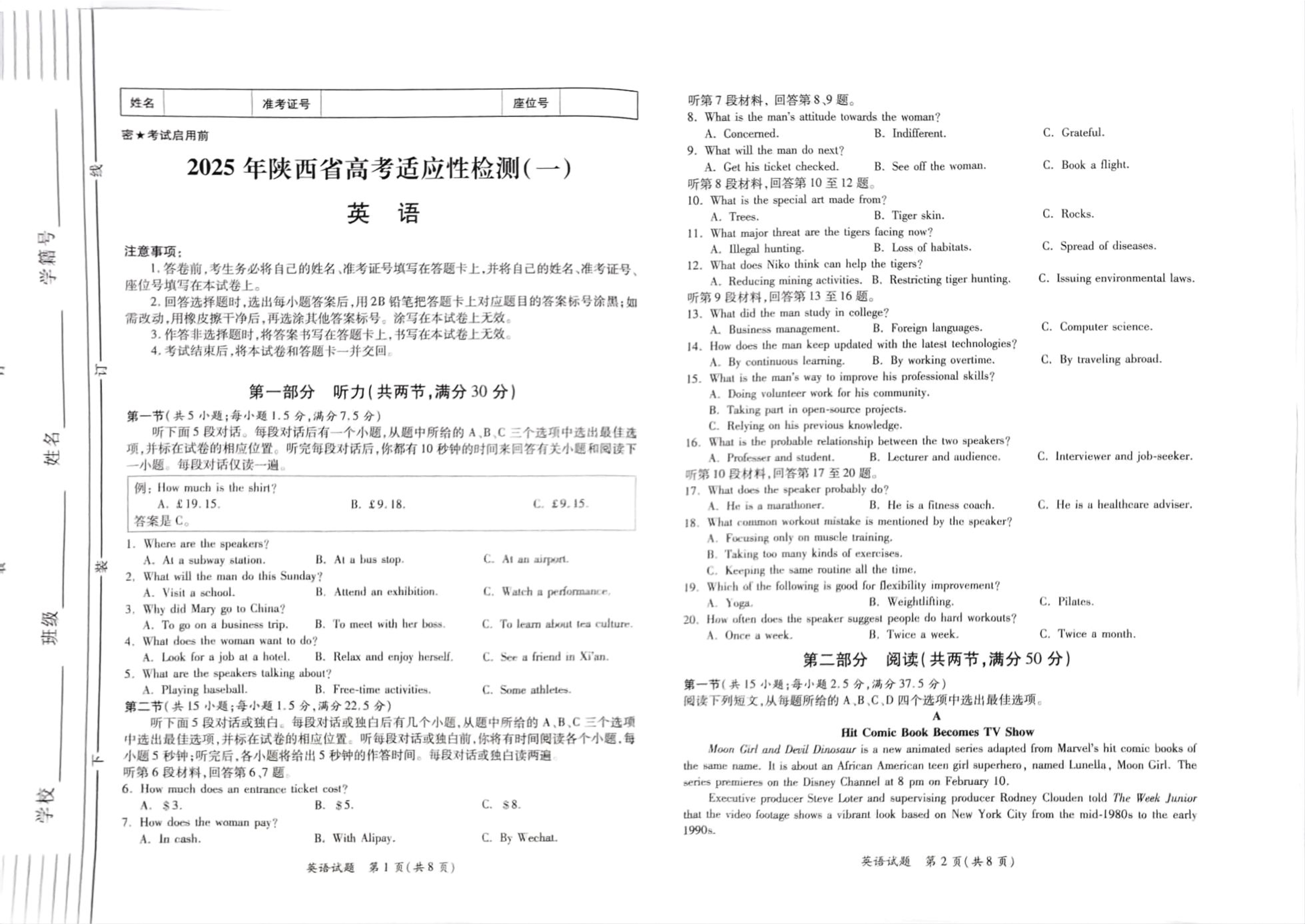 陕西省2025届高考适应性检测(一)英语