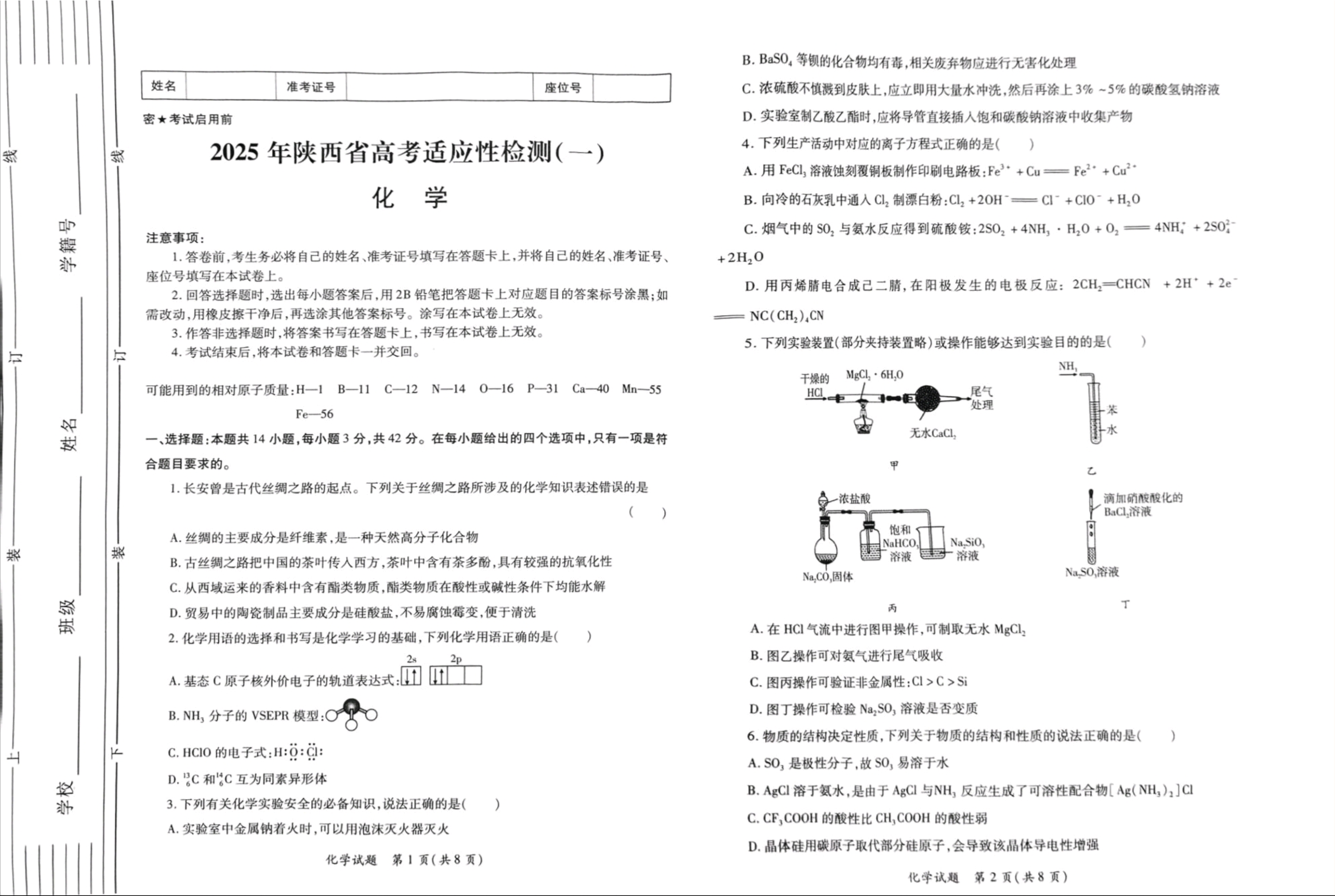 陕西省2025届高考适应性检测(一)化学