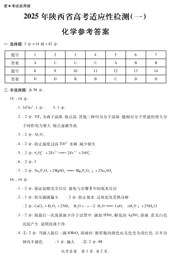 陕西省2025届高考适应性检测(一)化学答案