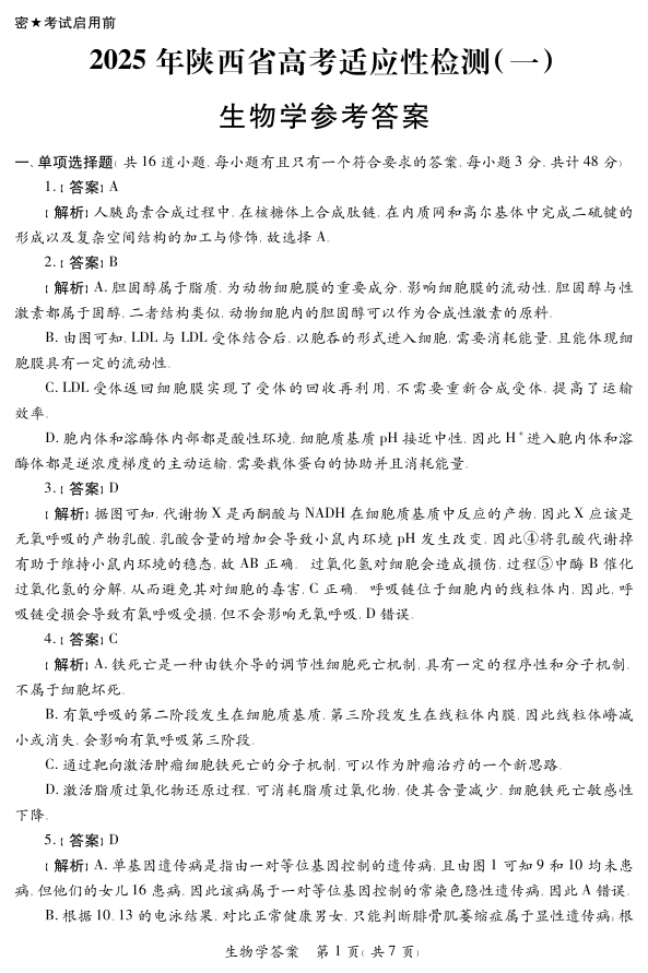 陕西省2025届高考适应性检测(一)生物答案