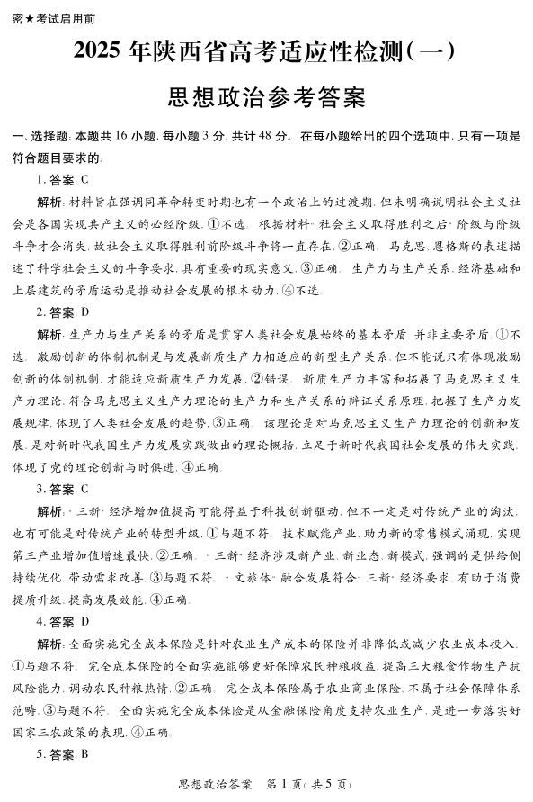 陕西省2025届高考适应性检测(一)政治答案