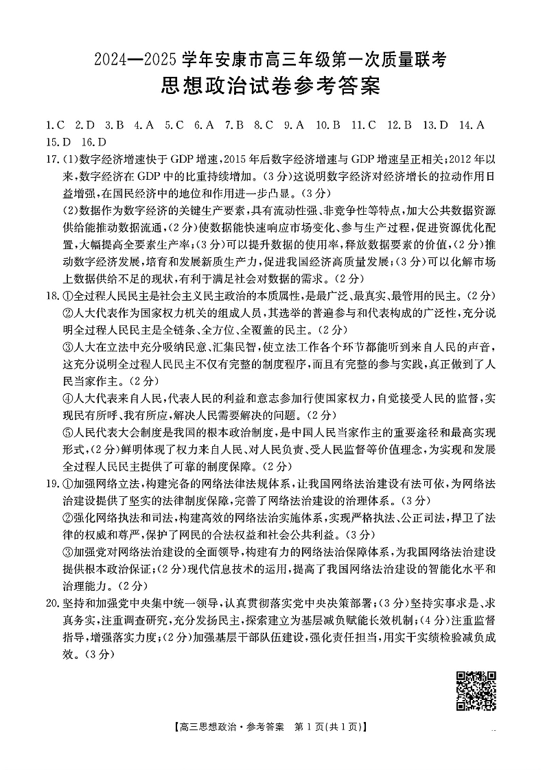 陕西省安康市2025届高三上学期第一次质量联考政治答案