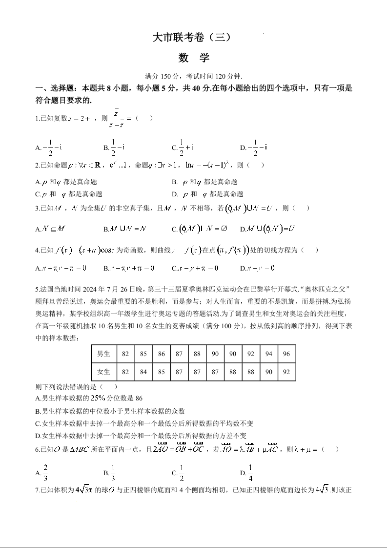 陕西省汉中市2025届高三上学期联考(三)(11月期中)数学+答案