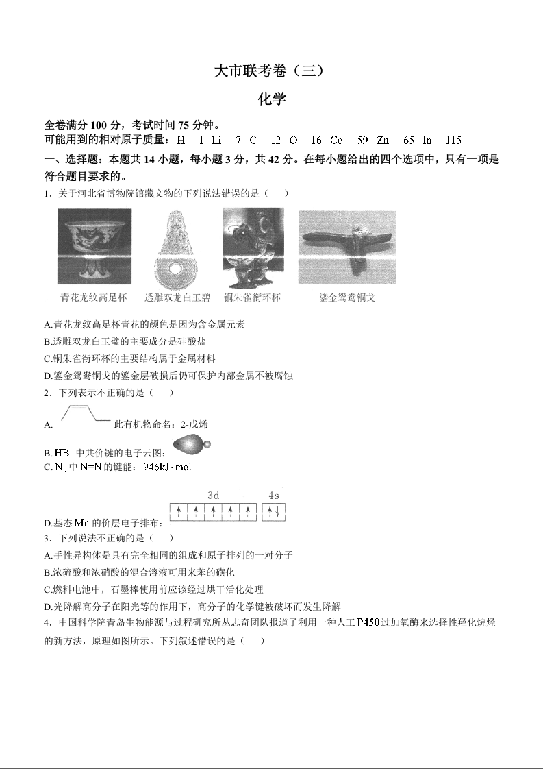 陕西省汉中市2025届高三上学期联考(三)(11月期中)化学+答案