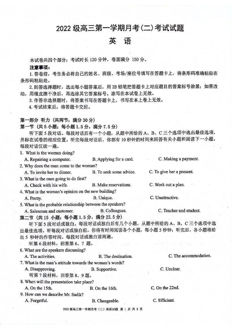 陕西省西安市2025届高三上学期11月联考一模英语