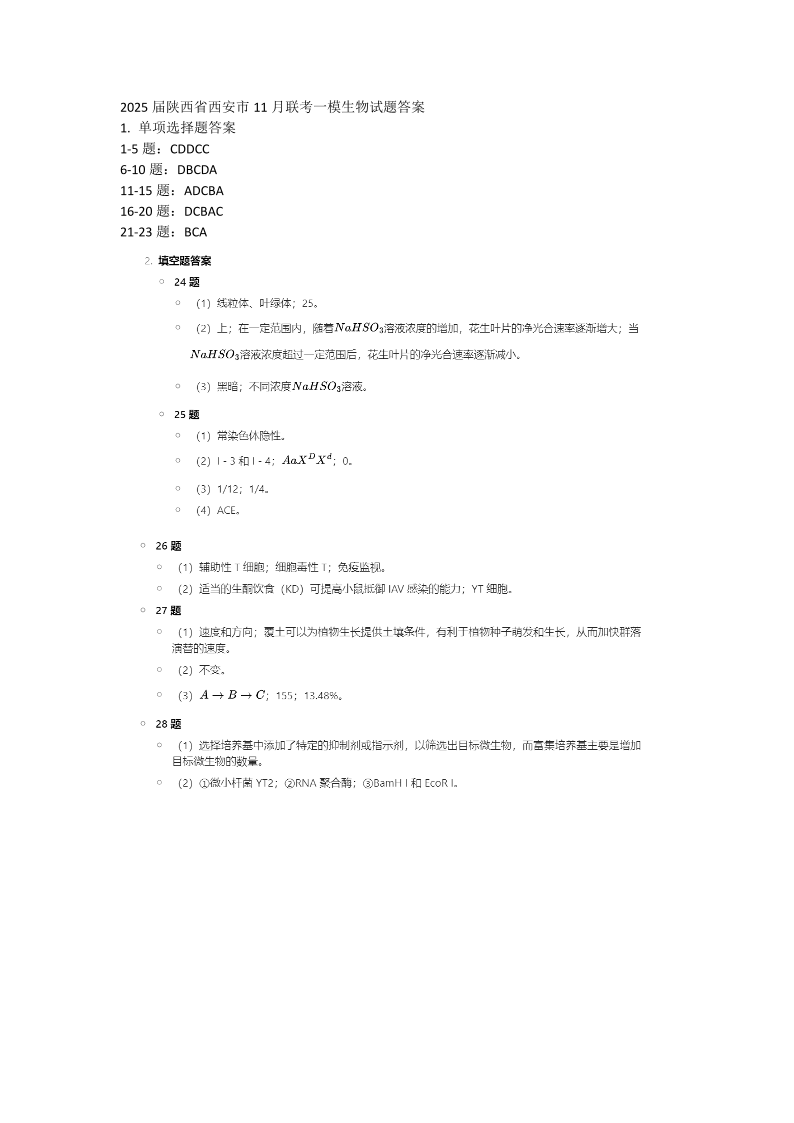 陕西省西安市2025届高三上学期11月联考一模生物答案