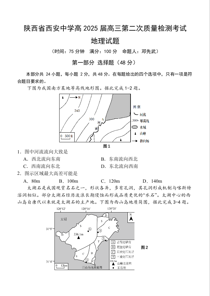 陕西省西安中学2024-2025学年高三上学期第二次调研考试地理