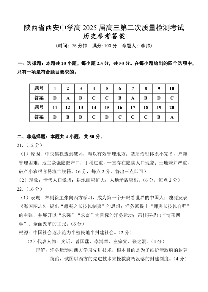 陕西省西安中学2024-2025学年高三上学期第二次调研考试历史答案