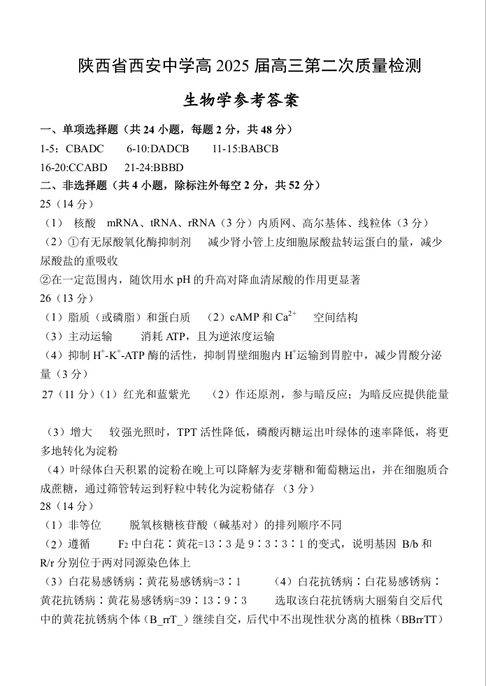 陕西省西安中学2024-2025学年高三上学期第二次调研考试生物答案