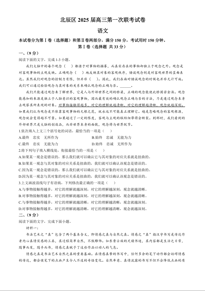 天津市北辰区2025届高三上学期11月期中考试语文