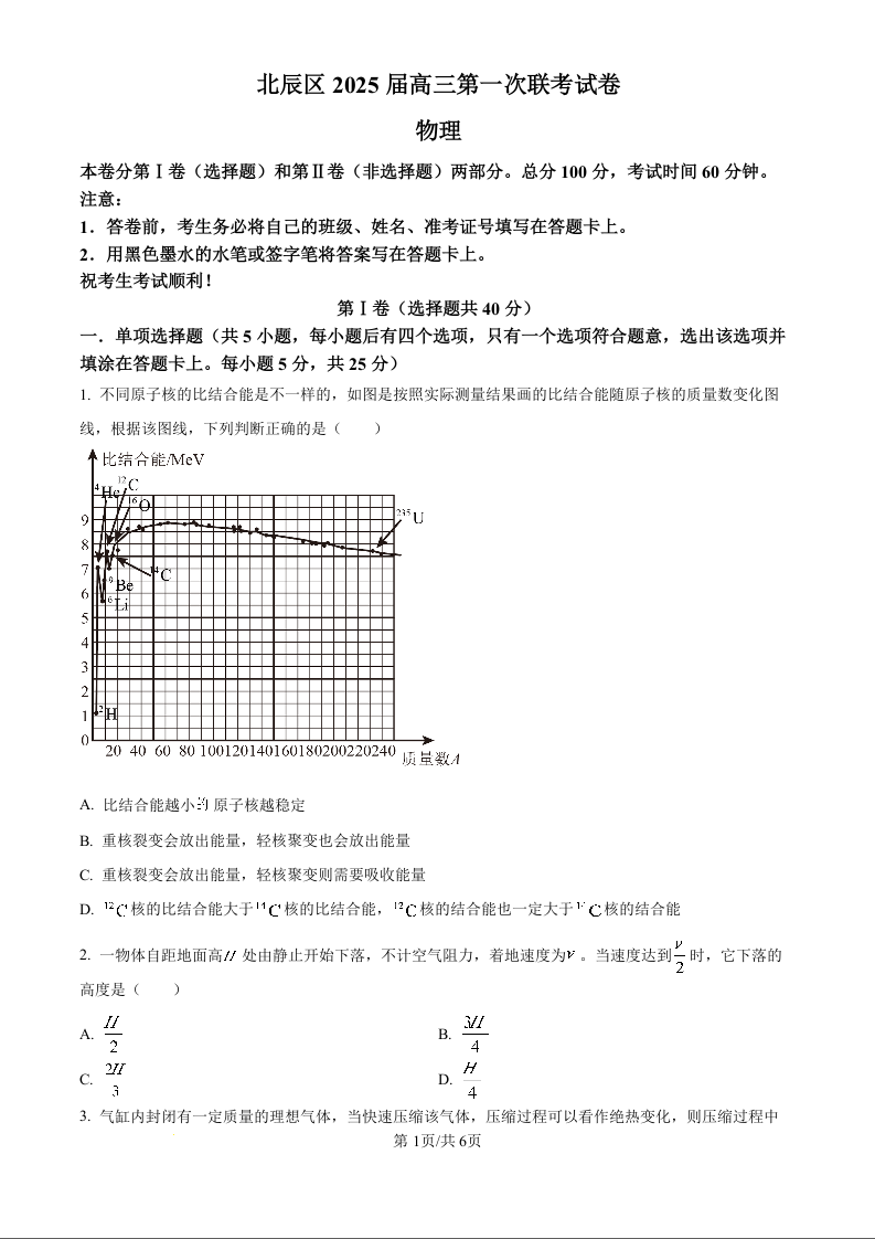天津市北辰区2025届高三上学期11月期中考试物理(原卷版)